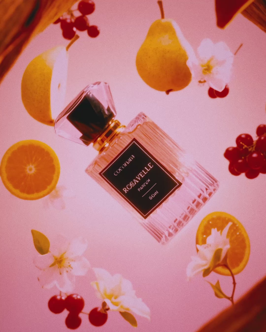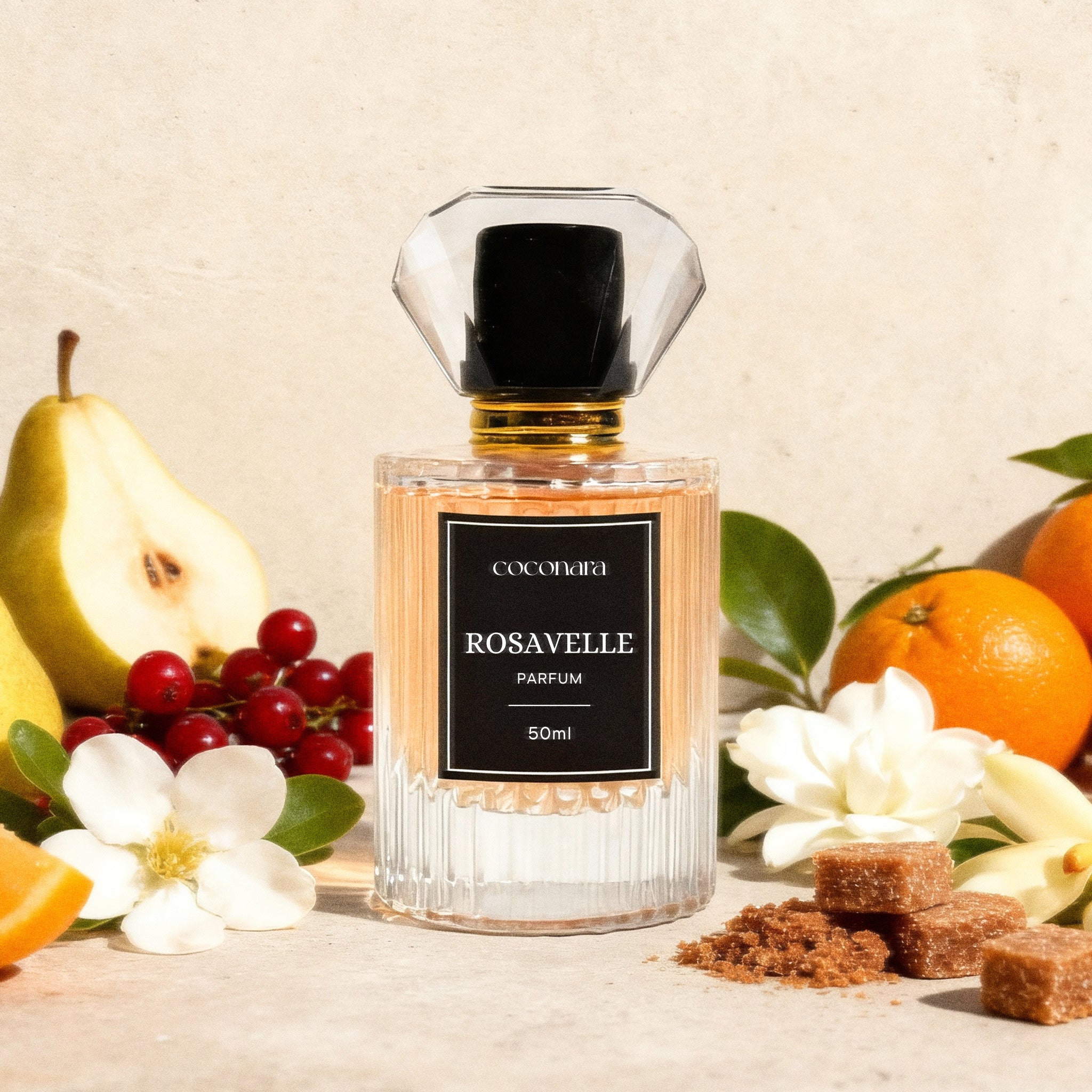 Rosavelle is a bouquet of modern femininity — soft, elegant, and radiant. It blends peony, citrus, and mandarin with a romantic heart of rose and osmanthus, anchored by a base of sandalwood and patchouli.